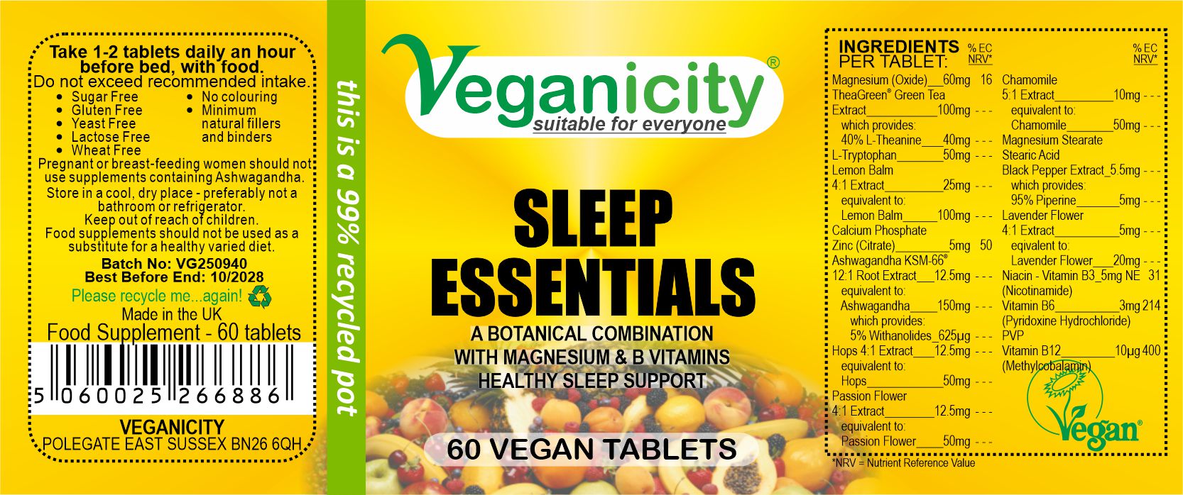 Modern life can sometimes leave us feeling stressed, anxious, overstimulated and exhausted, from busy work life balances to constant screen time and being pulled in so many different directions. This in turn often leads us to have broken sleep patterns, difficulty dozing off and wakeing up as exhausted as we were before heading to bed! This is where Veganicity's unique blend of relaxing nutrients and botanicals can help. Promoting a relaxed, calm and deep restful sleep, reducing tiredness and fatigue throughout the day and helping you nod off just when you want Sleep Essentials is the go to supplement for all!