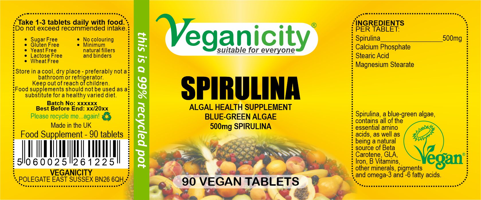 90 Vtabs of 500mg Vegan Spirulina, loaded with antioxidants and a range of other nutrients including 8 essential amino acids, making it a great source of protein, vitamins, minerals and fatty acids.