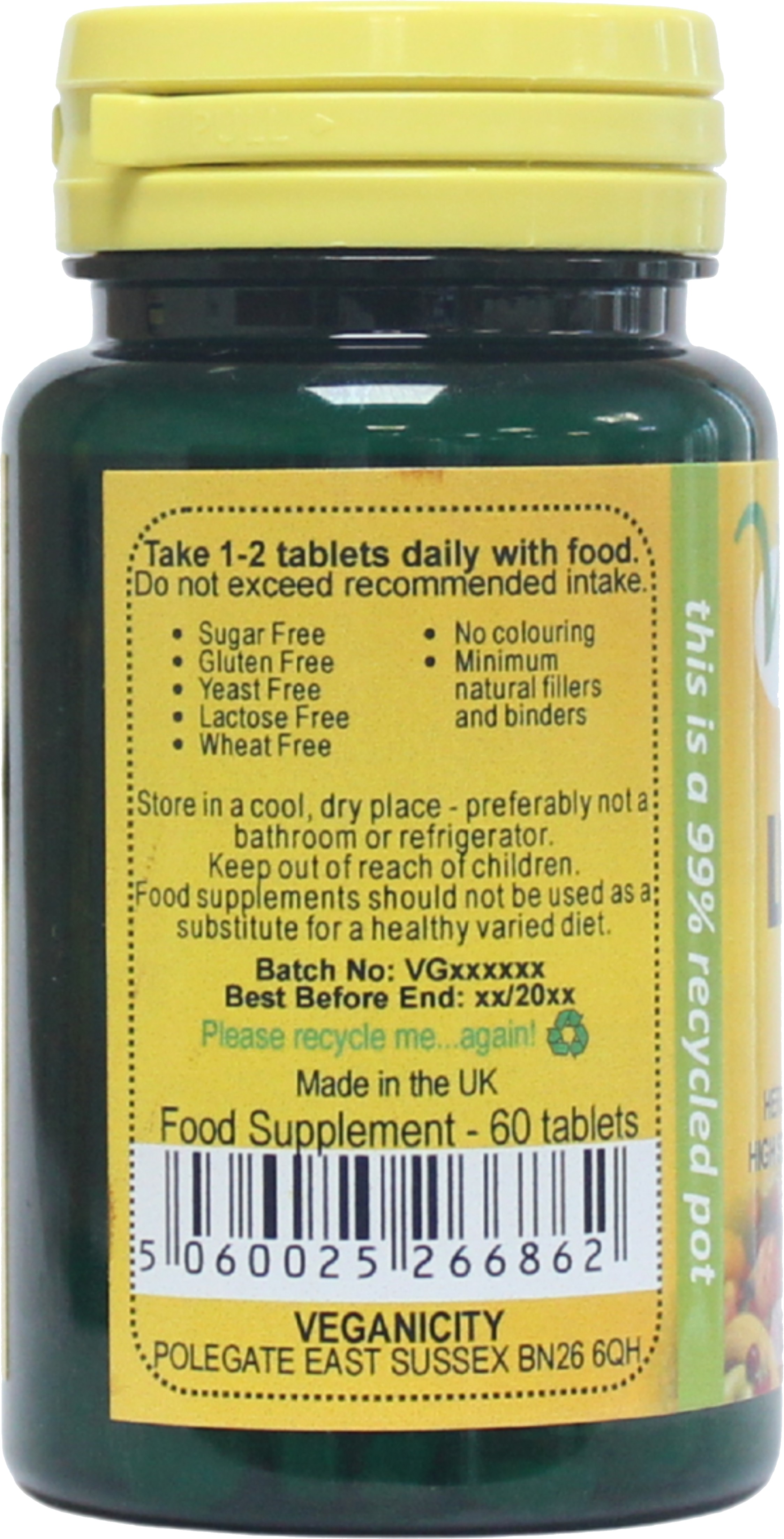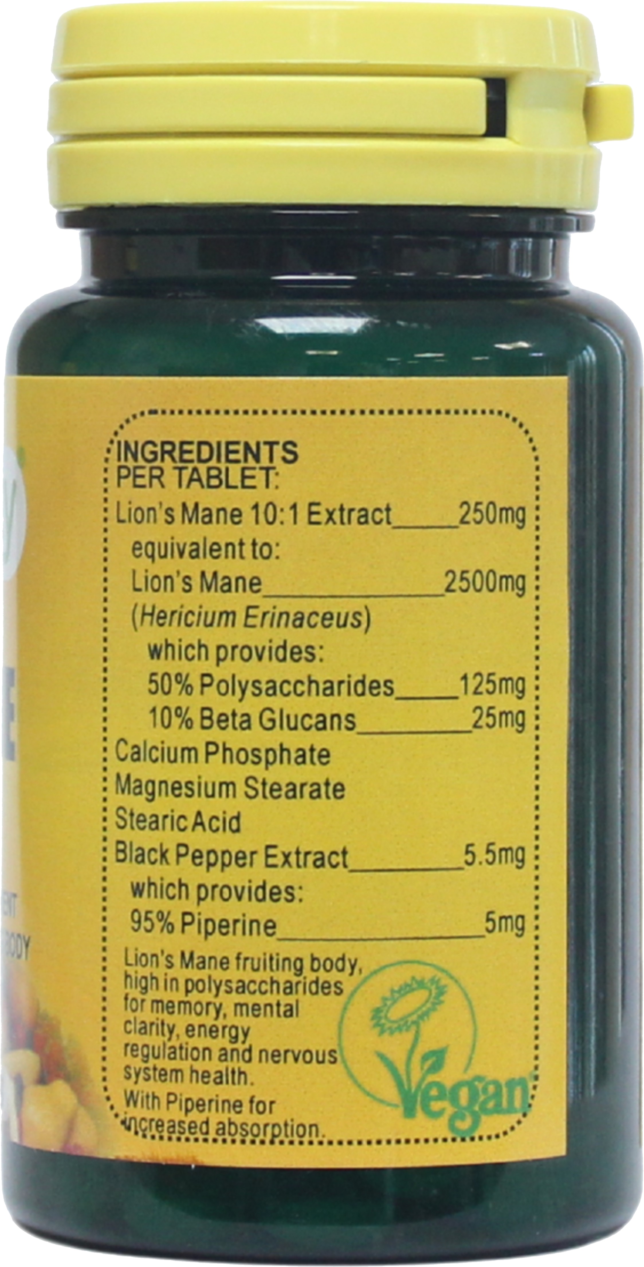 60 Vtabs of 2500mg Vegan Lion's Mane, naturally high in Polysaccharides - including Beta Glucans, which naturally support memory, mental clarity, focus and the health of the nervous system. Also renowned for it's effect on energy levels, to help reduce tiredness and fatigue. Presented here combined with Black Pepper Extract (Piperine) for enhanced absorption and better utilisation in the body.
